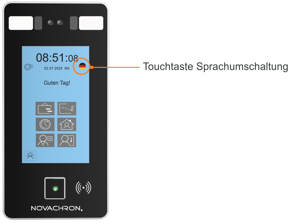 Durch mehrmaliges Drücken können Sie zwischen den Sprachen wählen. Die Benutzeroberfläche schaltet sofort in die ausgewählte Sprache um.