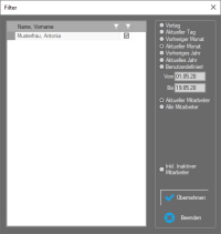 Jedoch können diese Mitarbeiter noch in angelegten Listen angezeigt werden. Dazu die gewünschte Liste aktivieren und im Auswahlfilter für die Listenausgabe den Markierungsschalter Inkl. Inaktiver Mitarbeiter aktivieren.