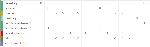 Innerhalb der Übersicht wird der dem jeweiligen Tag zugeordnete Tagesplan farblich angezeigt. Es erscheinen zusätzlich: |