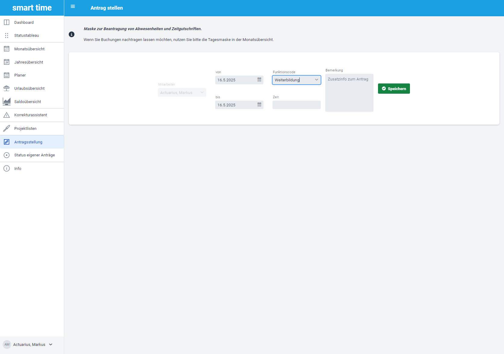 - Klicken Sie auf Speichern. Der Antrag wird an den verantwortlichen Vorgesetzten weitergeleitet.