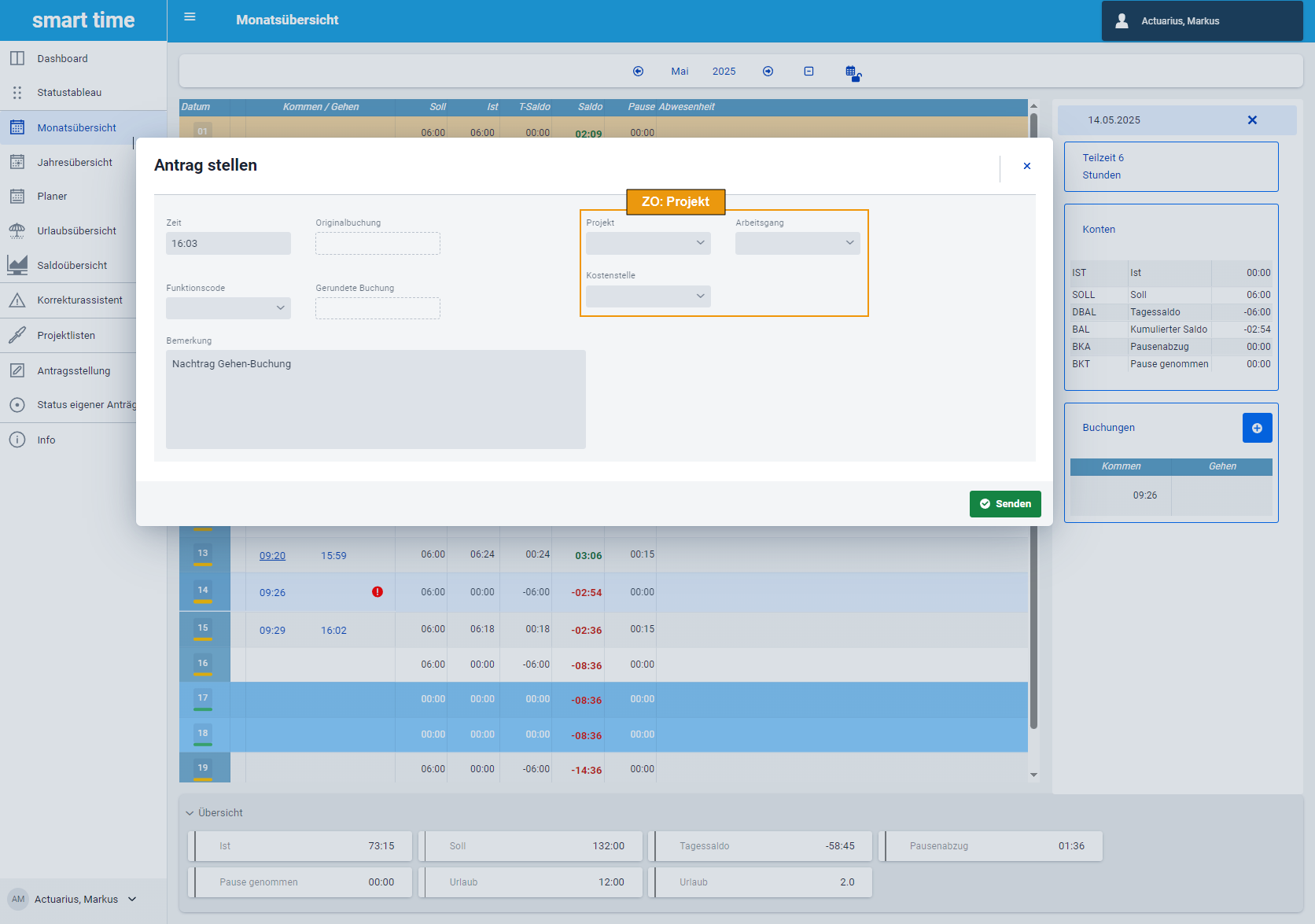 HINWEIS: Ein Buchungsantrag kann nur direkt in der Monatsübersicht gestellt werden.