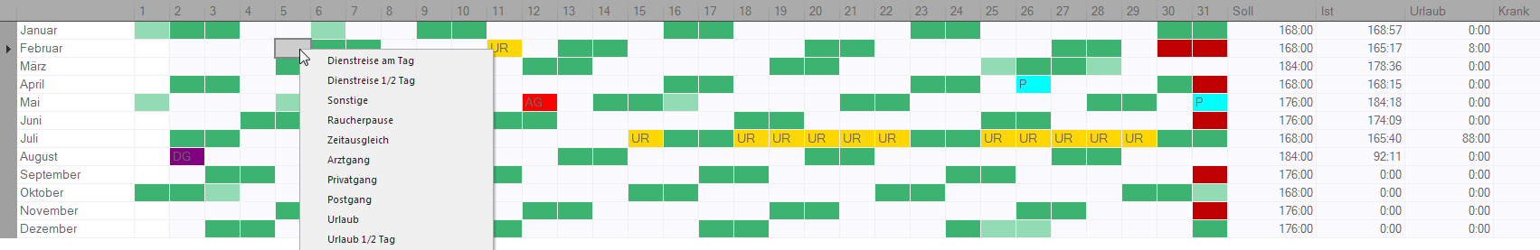 HINWEIS: Innerhalb der Jahresübersicht können Abwesenheiten nicht gelöscht werden, sondern nur im Menü Bearbeiten ► Abwesenheiten.