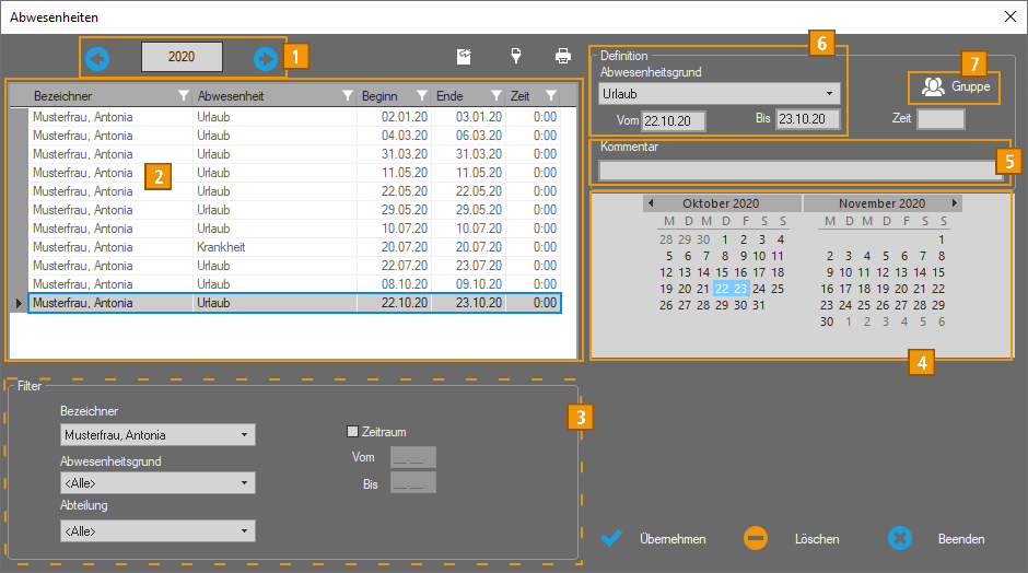 Standardmäßig erscheinen alle Abwesenheitsgründe eines einzelnen Mitarbeiters ohne Einschränkung des Anzeigezeitraums für das aktuelle Jahr. Über die Vorauswahl in der Rubrik „Filter“ kann die Anzeige durch bestimmte Auswahlkriterien eingeschränkt werden. Änderungen von Beginn- und Endzeiten können direkt in dieser Übersicht vorgenommen werden.