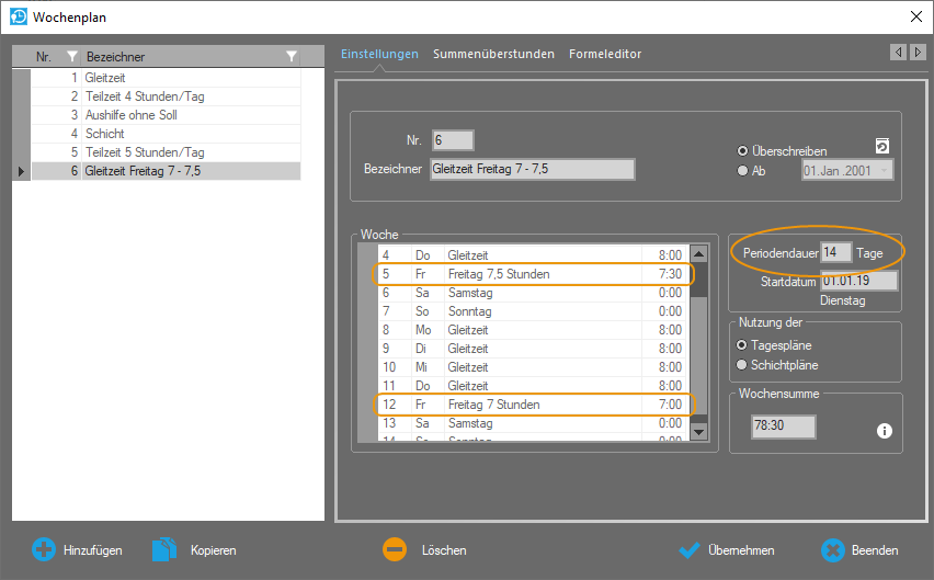 Beispiel: Alle zwei Wochen soll sich die Arbeitszeit am Freitag unterscheiden – In der ersten Woche beträgt die Arbeitszeit 7,5 Stunden und in der zweiten Woche 7,0 Stunden.