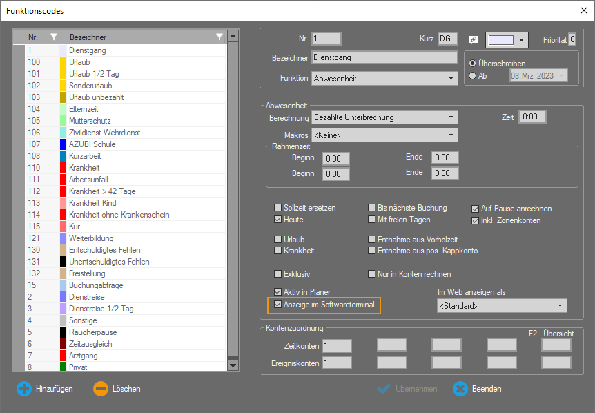 ändern Über die Software stehen programmierbare Funktionscodes zur Verfügung. Über diese definieren Sie Abwesenheitsgründe und Besonderheiten bei Buchungen. Standardmäßig werden die ersten 8 bzw. 10 Funktionscodes aus der Software angezeigt.