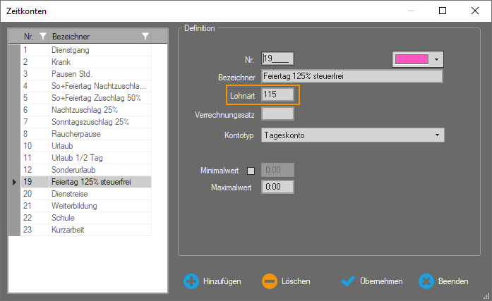 - Tragen Sie beim jeweiligen Konto unter Lohnart die Ihrem Lohnprogramm zugeordnete Lohnart ein. Mehrere Angaben wie zum Beispiel eine Lohnart und ein Ausfallschlüssel (DATEV) können durch das Trennzeichen getrennt in diesem Feld eingetragen werden. Bei Zeitkonten, die nicht übertragen werden sollen können Sie das Eingabefeld Lohnart leer lassen.