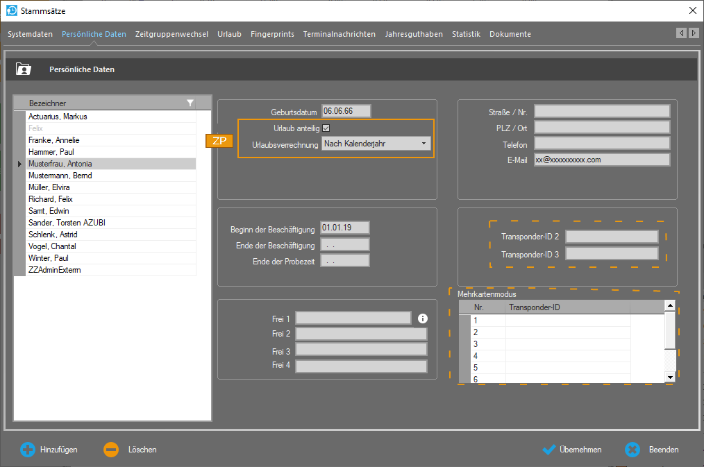 Mehrkartenmodus: Wurde unter Extras ►Allgemeine Parameter der Markierungsschalter Mehrkartenmodus aktiviert, erscheint hier eine zusätzliche Eingabemöglichkeit, um einem Mitarbeiter zusätzliche Transponder zuzuteilen.