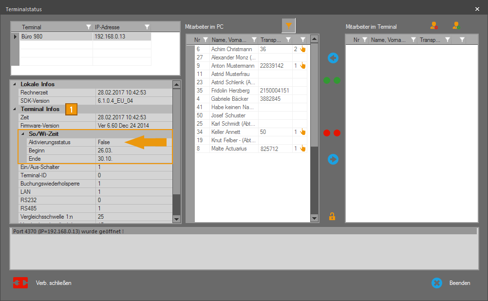 HINWEIS: Gleichen Sie danach einmalig von der Software aus die Uhrzeit zwischen Software und Terminal manuell ab Kommunikation ►Senden/Empfangen ►Uhren synchronisieren.
