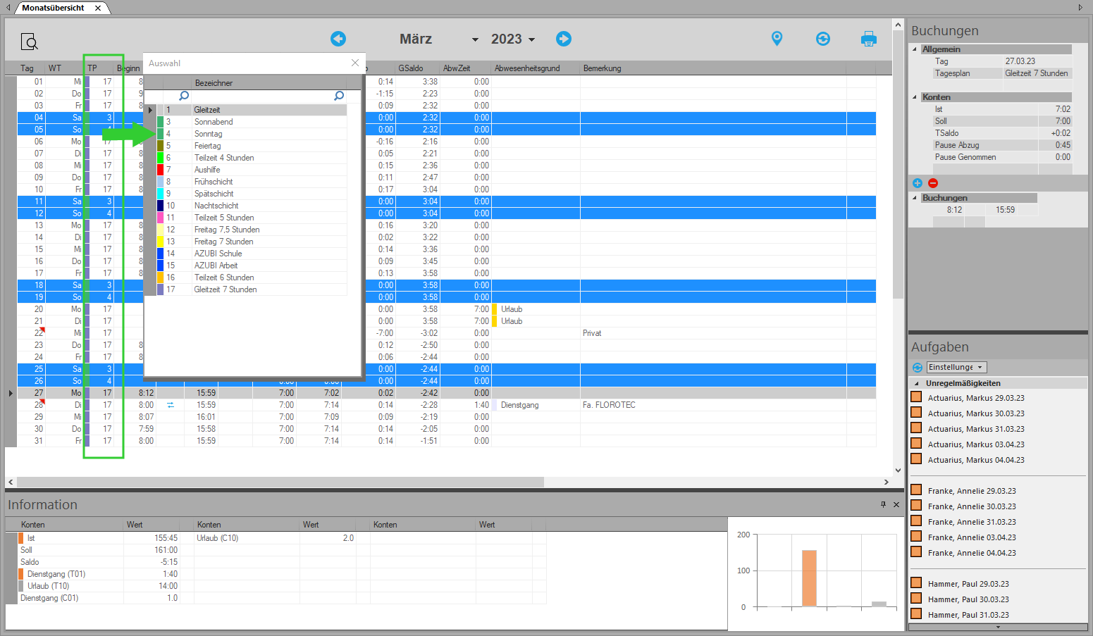 Beginn/Ende: Ein Tagesanfang bzw. Tagesende, innerhalb eines Tagesplans definiert, gilt immer für alle Mitarbeiter, denen dieser Tagesplan zugeordnet ist. Damit für kurzzeitige Änderungen kein neuer Tagesplan erstellt werden muss, gibt es die Möglichkeit zur Tagesanfangs-/ Tagesendeanpassung. Damit ist es möglich, für einzelne Mitarbeiter an gewünschten Tagen den Tagesanfang und/oder das Tagesende vorübergehend zu ändern. Ein Tag dauert von diesem Tagesbeginn bis zum nächsten Tagesbeginn des Folgetages. Uhrzeiten nach 24:00 Uhr werden zum Beispiel in der Form 24:00 + 3:00 = 27:00 eingegeben.