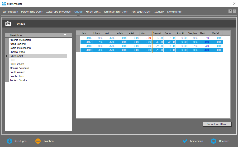 In bestimmten Fällen sind Korrekturen erforderlich, so zum Beispiel beim Systemstart im laufenden Jahr oder wenn Urlaubsanspruch durch Entgelt abgegolten wird.