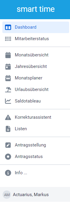 Nach der Anmeldung öffnet sich das sogenannte Dashboard. Ein Mitarbeiter, der über das Web zugreift, sieht standardmäßig nur seine eigenen Einträge. Wenn diese jedoch vom Administrator freigegeben wurden, hat er auch Zugriff auf Einträge von Kollegen, die denselben Vorgesetzten haben. Das Buchen über das Webterminal ist nur möglich, wenn der Vorgesetzte die entsprechenden Freigaben in der Benutzerverwaltung von smart time PLUS erteilt hat. Buchungs- und Abwesenheitsanträge werden von seinem Vorgesetzten genehmigt.