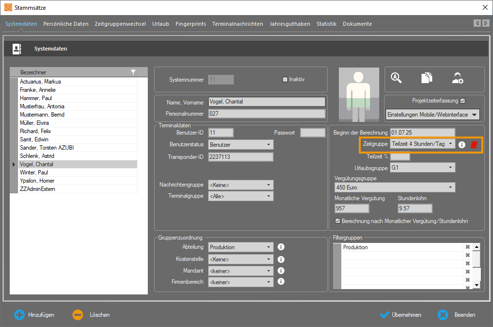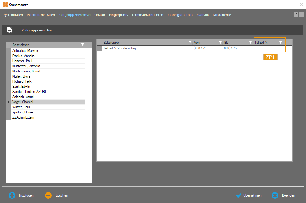 - Wählen Sie den Mitarbeiter, bei dem eine Änderung der Zeitgruppe erfolgen soll.