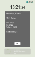 Wird jetzt beim Kommen bzw. Gehen am Terminal gebucht, erscheint ein Informationsfenster mit folgende Standard-Informationen: