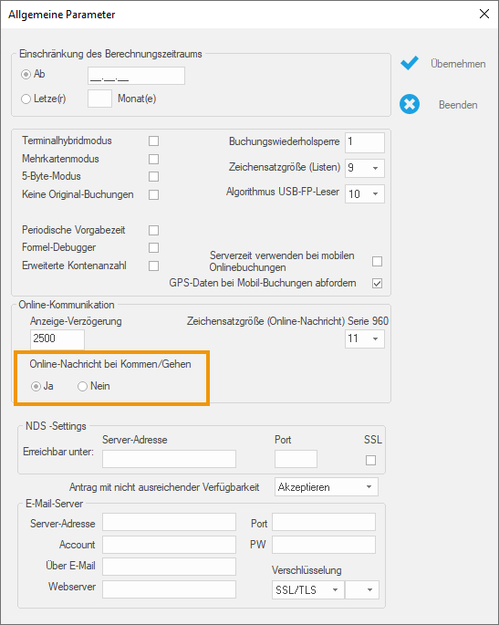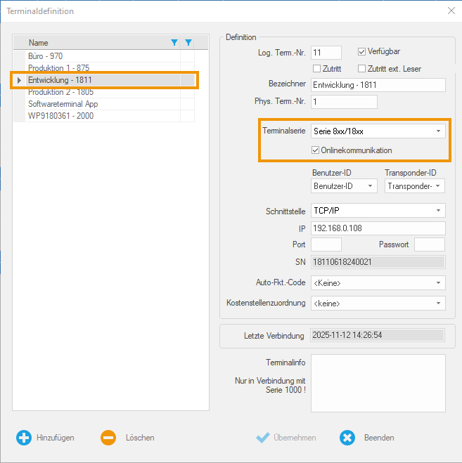 HINWEIS: Die Software unterstützt eine bidirektionale erweiterte Online-Kommunikation zum Beispiel für Anzeige Kommen- und Gehen-Status, Saldo, Resturlaub bei den Serien 1805 und 1811. Möglich ist das nur über die Kommunikationsart NDS.