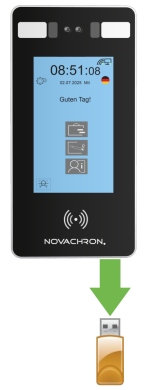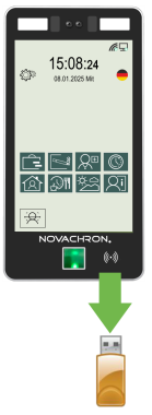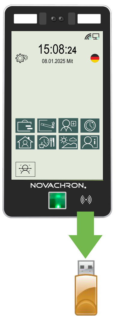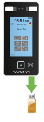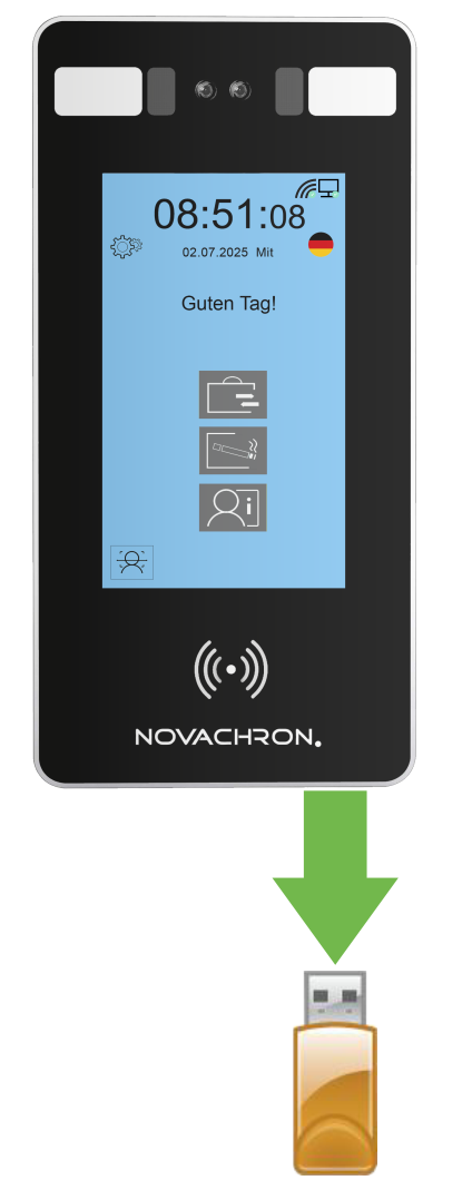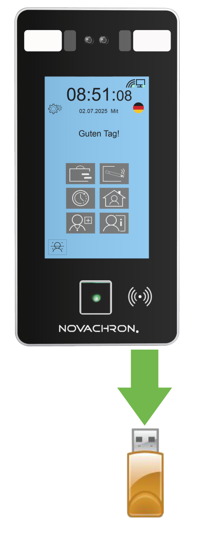 Verfügen Sie über keinen Zugang zu einer Netzwerkverbindung oder Sie können das Terminal nicht in Ihrem Netzwerk integrieren, haben Sie die Möglichkeit, mit einem USB-Speicher Buchungsdaten, Benutzerdaten und Adminlogs vom Terminal abzurufen.