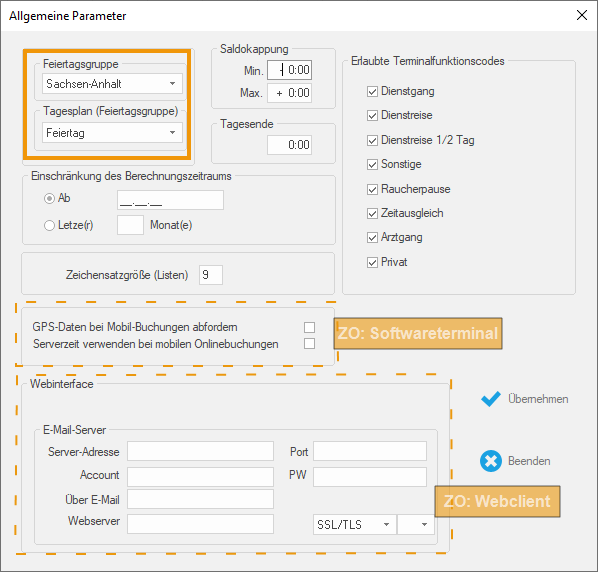 Unter Extras ►Allgemeine Parameter können Sie die jeweils gültige Feiertagsgruppe für die deutschen Bundesländer, Österreich, die Schweiz, Südtirol und Belgien zuordnen.