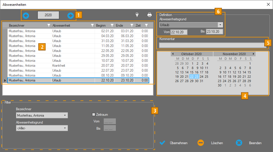 Standardmäßig erscheinen alle Abwesenheitsgründe eines einzelnen Mitarbeiters ohne Einschränkung des Anzeigezeitraums für das aktuelle Jahr. Über die Vorauswahl in der Rubrik „Filter“ kann die Anzeige durch bestimmte Auswahlkriterien eingeschränkt werden. Änderungen von Beginn- und Endzeiten können direkt in dieser Übersicht vorgenommen werden.