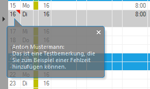 Eine hier eingetragene Bemerkung dient der Information. Wurden zu Abwesenheiten Bemerkungen hinzugefügt, wird in der Monatsübersicht in der Spalte „Tag“ ein rotes Dreieck und ein dazugehöriges Informationsfenster mit dem Text der Bemerkung angezeigt. Eingetragene Bemerkungen können auch innerhalb von Listen als Spalte „Bemerkungen“ ausgegeben werden. Weitere Informationen Abschnitt Eigene Liste erstellen.