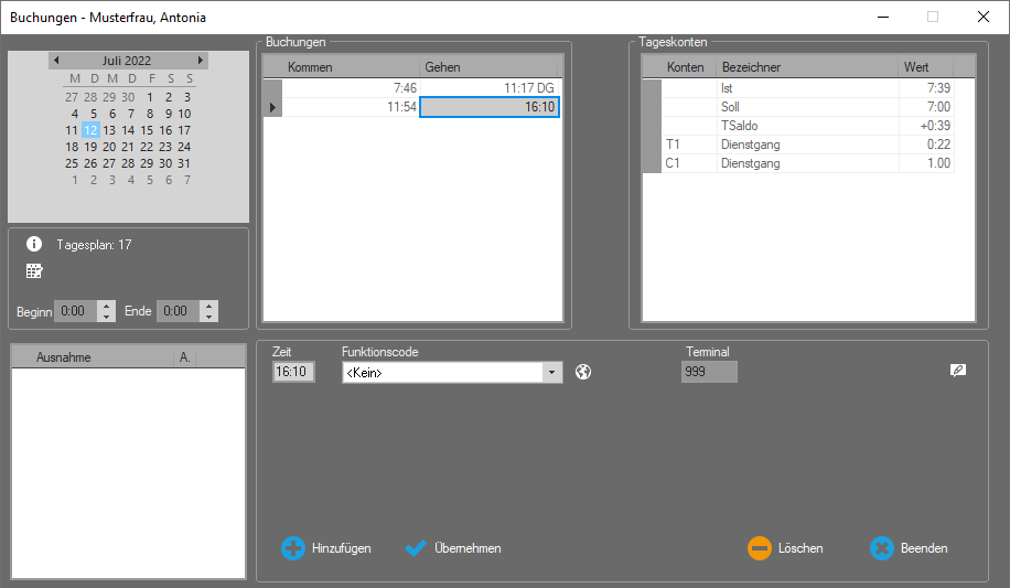 Terminal: Im Anzeigefeld Terminal wird die Terminalnummer nur angezeigt, wenn Buchungen direkt an einem Terminal erzeugt wurden. Bei manuell eingefügten Buchungen ist dieses Feld leer.