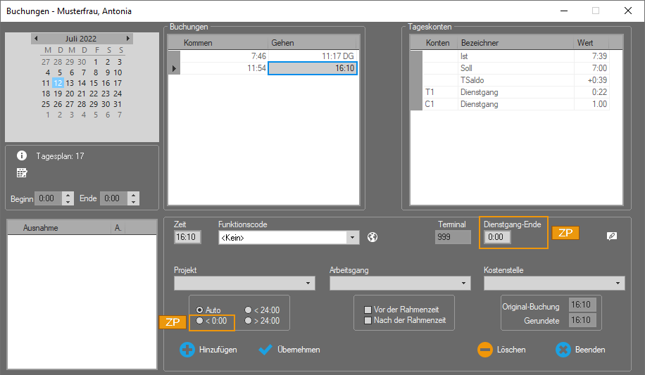 Bei korrekter Parametrierung der Tagespläne werden die Buchungen automatisch dem logisch richtigen Datum zugeordnet.