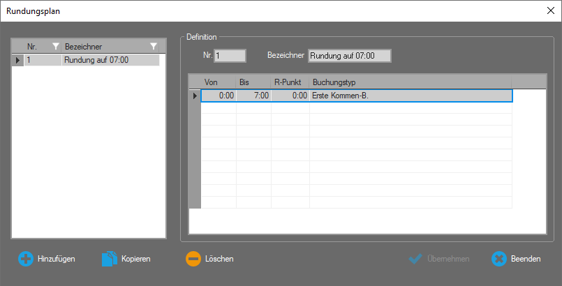 Erstellen Sie unter Programm ► Rundungsplan einen Rundungsplan von 0:00 Uhr bis 07:00 Uhr. Setzen den Rundungspunkt auf „0:00“ Uhr. Als Buchungstyp können Sie „Erste Kommen-B.“ auswählen. Somit wird jedes Einbuchen vor 7:00 Uhr auf 7:00 Uhr vorgerundet.![]()