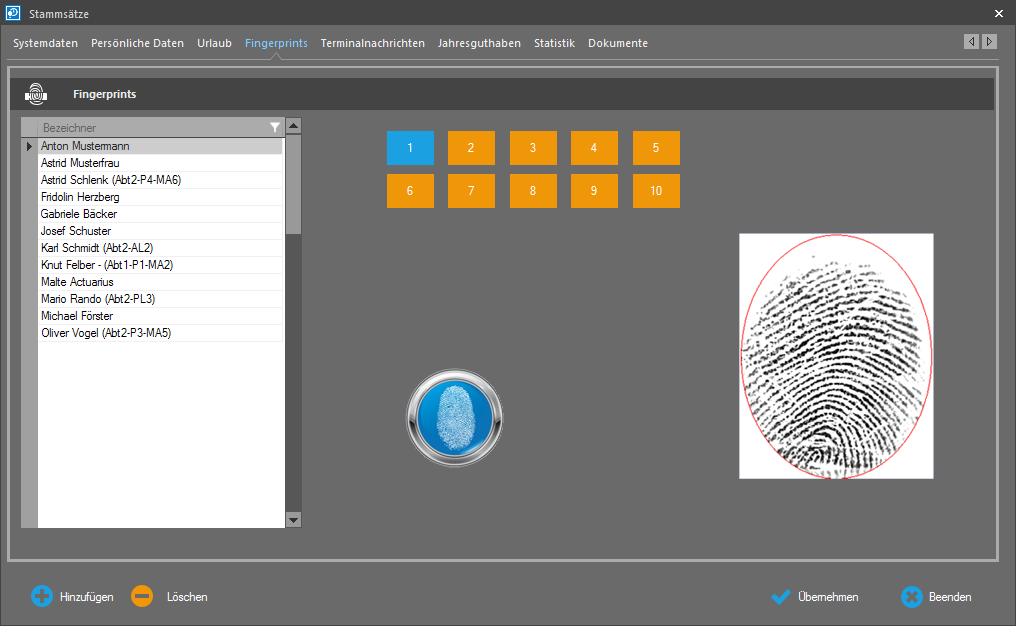 Unter dem Register „Fingerprints“ haben Sie die Möglichkeit, für einen Mitarbeiter bis zu zehn Fingerabdrücke einzulesen. Diese werden in Datensätze – sogenannte Templates – umgewandelt, als solche gespeichert und können auf die einzelnen Terminals übertragen werden.