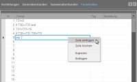 Der Formeleditor verfügt über eine kontext-sensitive Auswahl. Diese erreichen Sie, in dem Sie im jeweiligen Formeleditor mit der rechte Maustaste auf eine Zeile klicken. Es stehen Ihnen folgende Funktionen zur Verfügung: