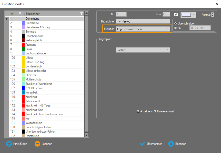 Ab: Diese Option erscheint erst mit Zusatzpaket 1. Wenn aktiviert, kann bei einer Änderung des Funktionscodes, der Zeitpunkt festgelegt werden, ab dem die vorgenommene Änderung gelten soll. Damit bleiben Berechnungen vor diesem Zeitpunkt von der Änderung unberührt.