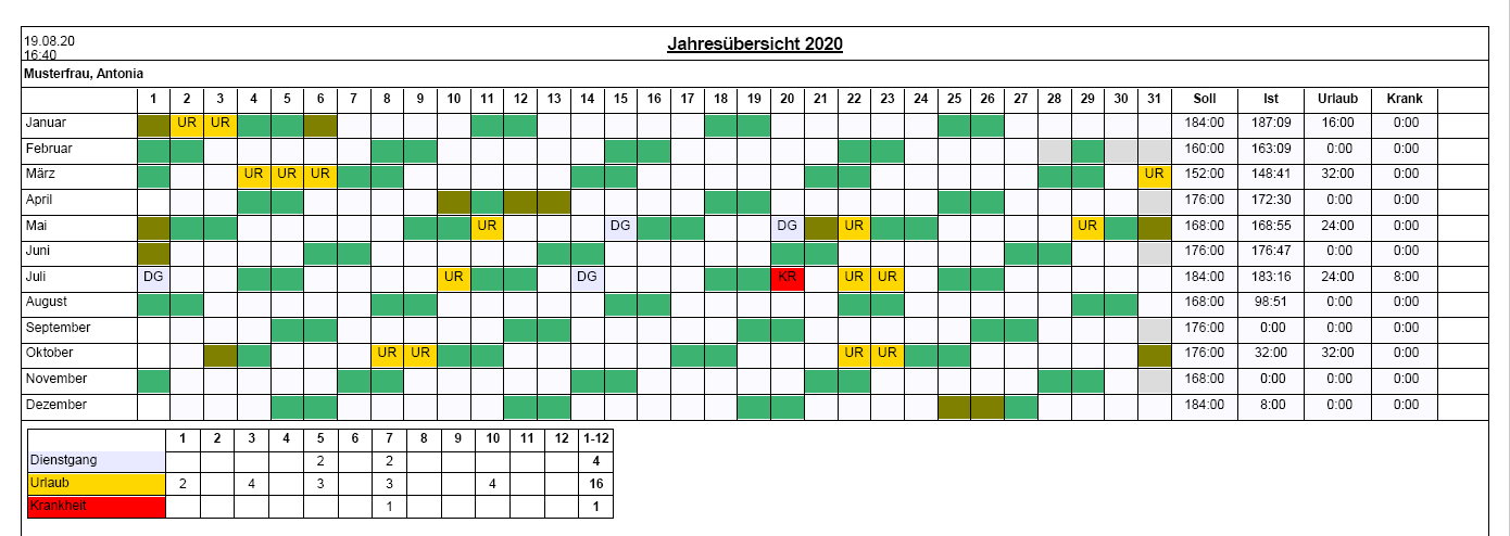 Mit der Jahresübersicht steht Ihnen ein Informationsinstrument zur Verfügung, das Ihnen den täglichen An- und Abwesenheitsstatus eines ausgewählten Mitarbeiters für ein Kalenderjahr anzeigt. Für jeden Monat erhalten Sie zusätzlich einen schnellen Überblick über die Soll- und Ist-Arbeitszeit sowie Urlaubs- oder Krankheitstage.