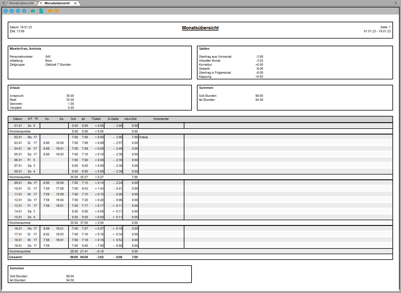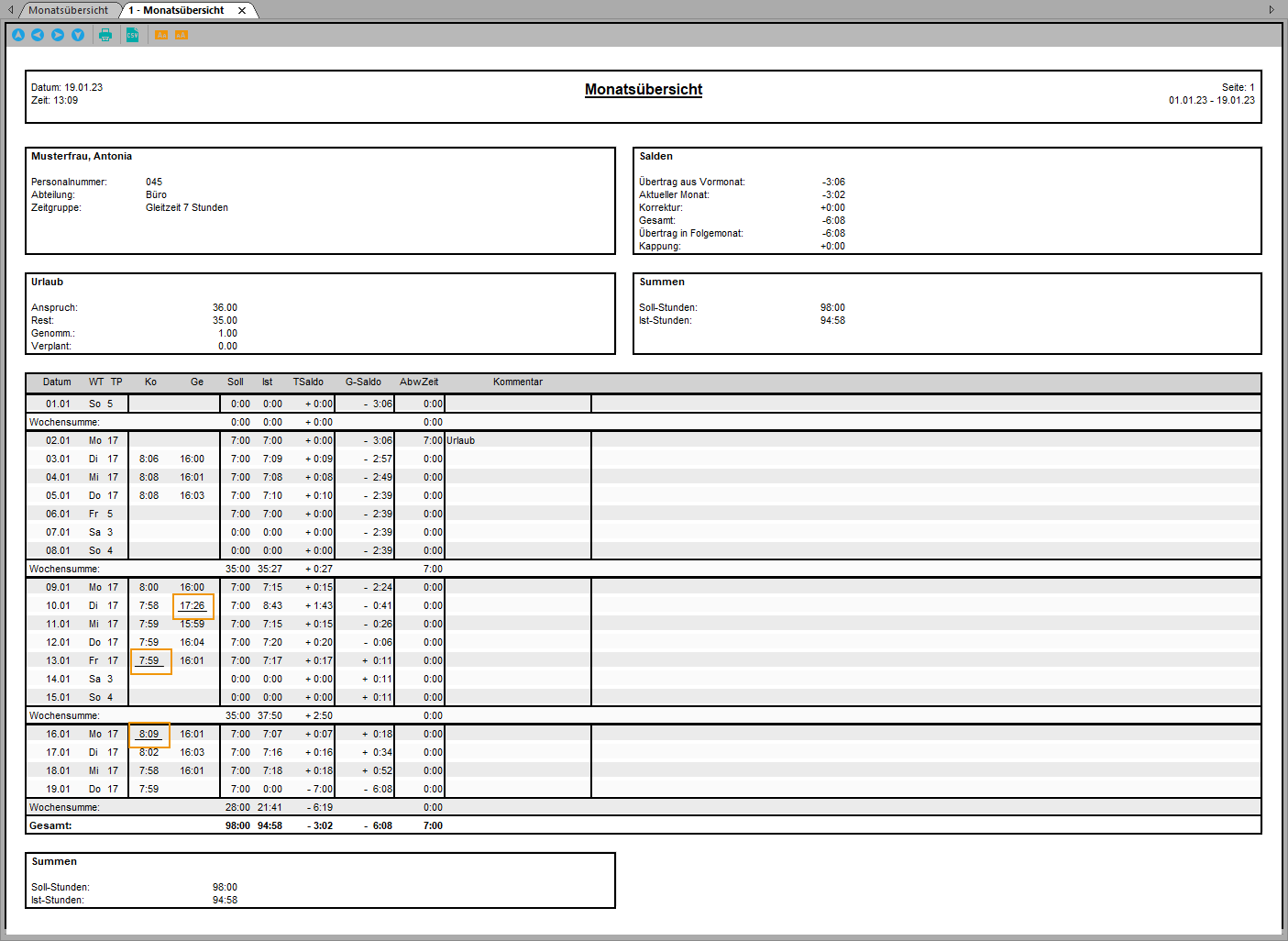 Im Normalfall werden in den Listen „Monatsübersicht“ und „Tagesübersicht“ korrigierte oder hinzugefügte Buchungen unterstrichen. In bestimmten Fällen kann es notwendig sein, Listen ohne diese Kennzeichnung der manuellen Buchungen bzw. Korrekturen auszudrucken.
