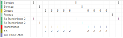 - im unteren Bereich eine Legende mit der genauen Bezeichnung der Tagespläne in den dafür hinterlegten Farben, einschließlich Aufsummierung.