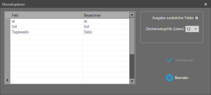 Ausgabe zusätzlicher Felder: Wird dieser Markierungsschalter aktiviert, erscheinen die neuen Spalten am Bildschirm und können auch mit dem Monatsplan ausgedruckt werden.