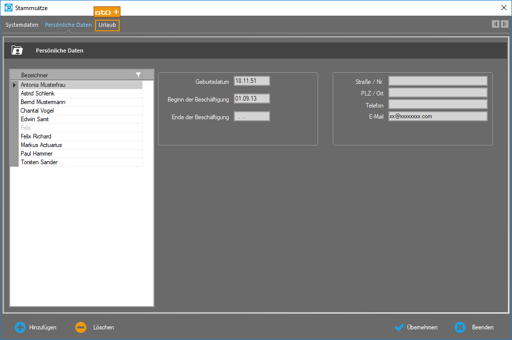 E-Mail: Neben dem informellen Charakter ist die E-Mail-Adresse relevant bei der Zusatzoption Webclient. Mitarbeiter können auf diesem Weg über die Genehmigung oder Ablehnung von Anträgen bzw. Vorgesetzte oder deren Vertreter über den Genehmigungsablauf informiert werden.Eingabe zur Information nach Bedarf vornehmen.