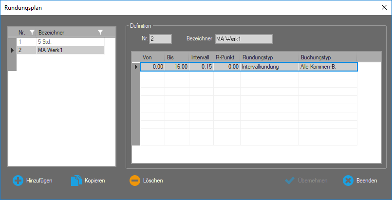 Bei der Intervallrundung wird ein definierter Gesamtzeitraum des Arbeitstags in gleichmäßige Zeitintervalle unterteilt (zum Beispiel 15 min). Alle gerechneten Tagesarbeitszeiten werden dann automatisch auf dieses Raster von 15 min angepasst.