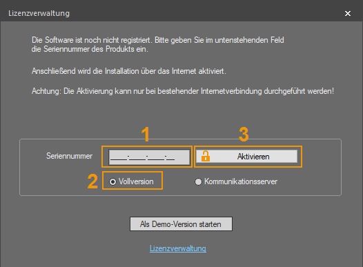 - Tragen Sie die vierzehnstellige Seriennummer in das Eingabefeld ein (1). Die Seriennummer finden Sie auf der Rechnung bzw. in der E-Mail mit dem Downloadlink für die Software.