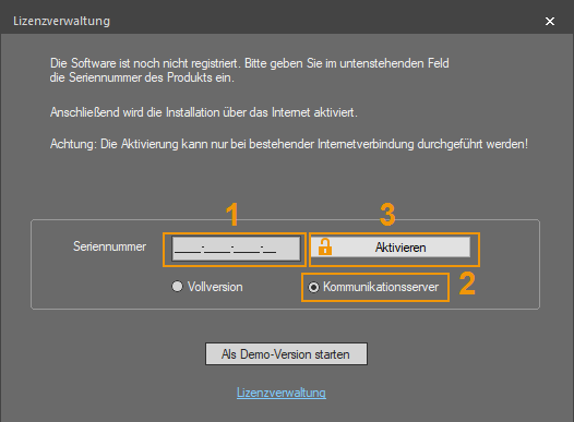 Mit der Auswahl „Kommunikationsserver“ wird die Kommunikationsserverlizenz verbraucht. Diese ist Lieferbestandteil Ihres erworbenen Softwarepakets.