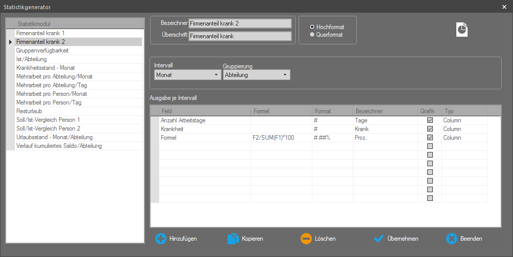 Mit der Schaltfläche „Kopieren“ haben Sie die Möglichkeit, eine bereits vorhandene Statistik zu kopieren, entsprechend den Anforderungen zu ändern und als neue Statistik abzuspeichern.