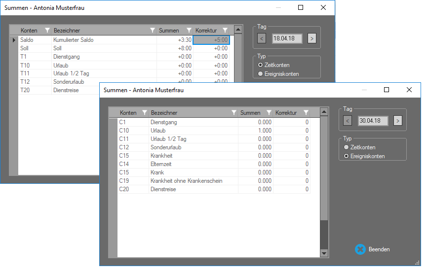 Die Software führt je Kalendertag und Mitarbeiter bis zu 80 25 ) Konten. Über das Menü Bearbeiten ►Summen haben Sie die Möglichkeit, den Inhalt aller selbst definierten Zeit- und Ereigniskonten und eines Teils der internen Konten zu verändern.