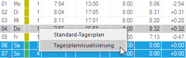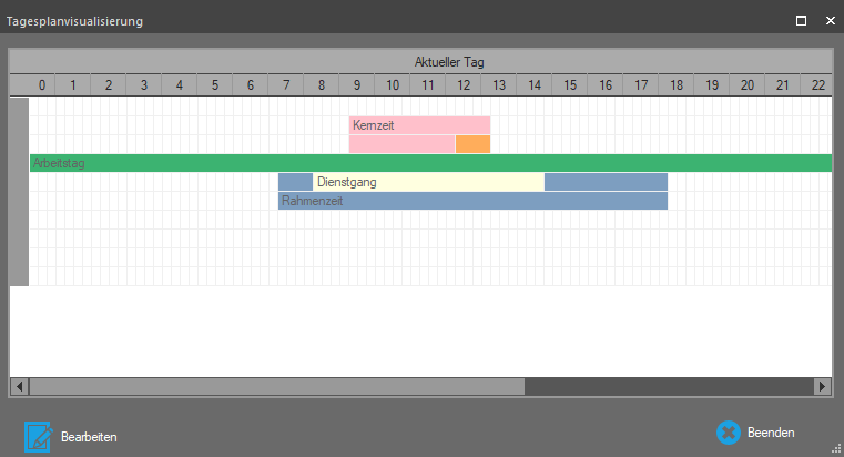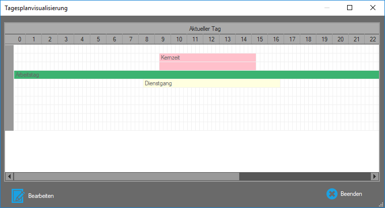 Für angewählte Tagespläne können von der Monatsübersicht aus über die Funktion „Tagesplanvisualisierung“ die definierten Parameter in einem Zeitstrahl grafisch dargestellt werden.