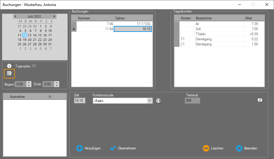 Beginn/Ende: Ein Tagesanfang bzw. Tagesende, innerhalb eines Tagesplans definiert, gilt immer für alle Mitarbeiter, denen dieser Tagesplan zugeordnet ist. Damit für kurzzeitige Änderungen kein neuer Tagesplan erstellt werden muss, gibt es die Möglichkeit zur Tagesanfangs-/ Tagesendeanpassung. Damit ist es möglich, für einzelne Mitarbeiter an gewünschten Tagen den Tagesanfang und/oder das Tagesende vorübergehend zu ändern. Ein Tag dauert von diesem Tagesbeginn bis zum nächsten Tagesbeginn des Folgetages. Uhrzeiten nach 24:00 Uhr werden zum Beispiel in der Form 24:00 + 3:00 = 27:00 eingegeben.