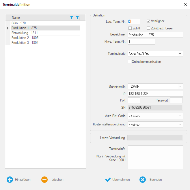IP: Freie IP-Adresse aus dem bestehenden Netzwerk eintragen. Werkseitig ist die IP-Adresse für die Terminalserien 9xx auf 192.168.1.201 und für die Terminalserien 8xx und 18xx auf 192.168.1.224 in der Software und am Terminal voreingestellt. Bei Kommunikationsproblemen bzw. bei mehreren angeschlossenen Terminals müssen die voreingestellten IP-Adressen mit freien IP-Adressen des Netzwerks überschrieben werden. Die IP-Adressen in der Software ( Fenster „Terminaldefinition“) und im Terminal müssen zwingend übereinstimmen. Die Information zum Ändern der IP-Adresse im Terminal entnehmen Sie bitte Ihrem Terminalhandbuch.