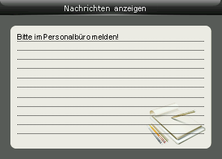 Je nach Bedarf besteht die Möglichkeit, einem Mitarbeiter so genannte „Persönliche Nachrichten“ über ein Terminal zu senden. Diese werden dem Mitarbeiter bei allen Buchungsvorgängen am Terminal angezeigt.