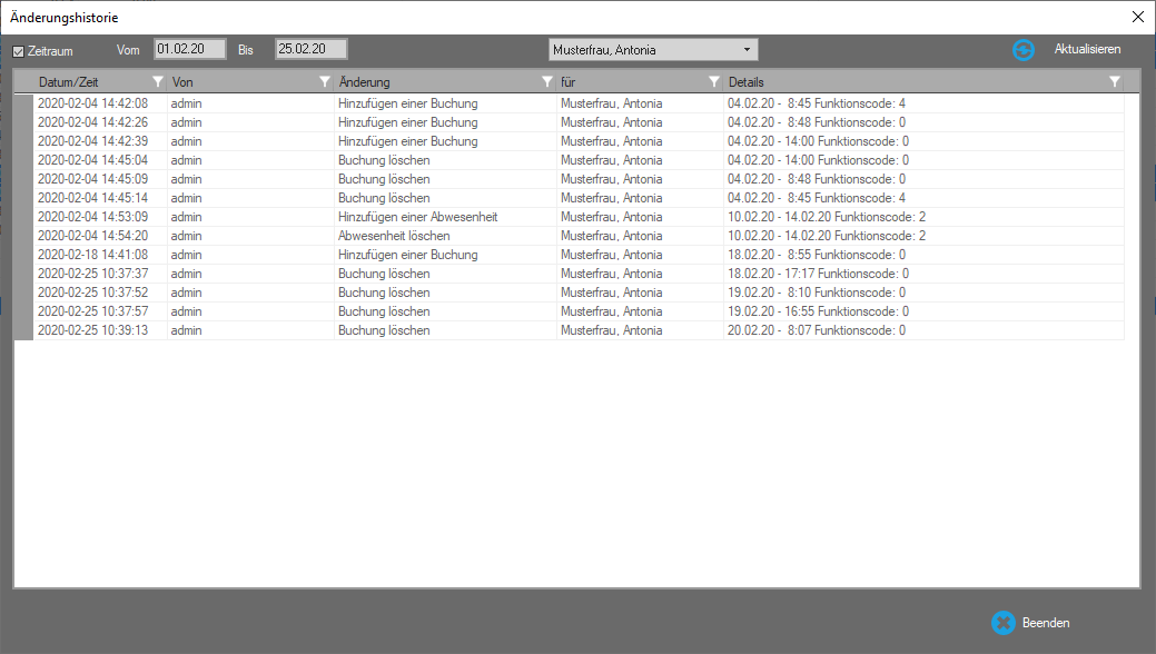 - Klicken Sie auf Extras ► Änderungshistorie. Durchgeführte Buchungsänderungen werden aufgeführt.