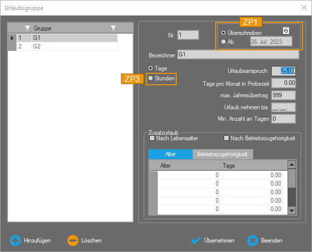 Ab: Diese Option erscheint erst mit Zusatzpaket 1. Wenn aktiviert, kann bei einer Änderung der Urlaubsgruppe, der Zeitpunkt festgelegt werden, ab dem die vorgenommene Änderung gelten soll. Damit bleiben Berechnungen vor diesem Zeitpunkt von der Änderung unberührt.