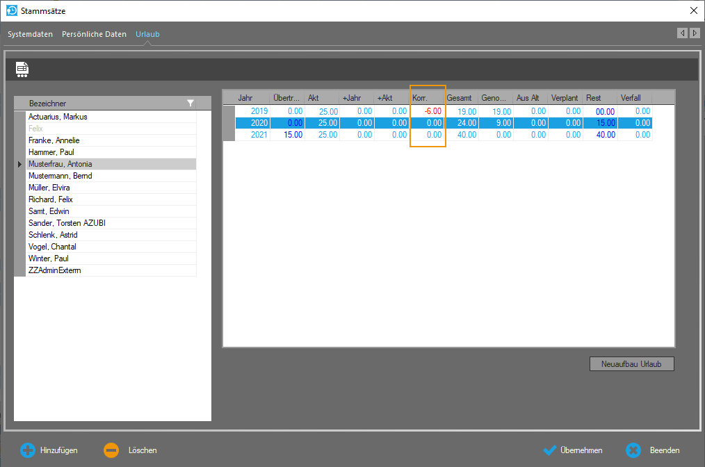 In bestimmten Fällen sind Korrekturen erforderlich, so zum Beispiel beim Systemstart im laufenden Jahr oder wenn Urlaubsanspruch durch Entgelt abgegolten wird.