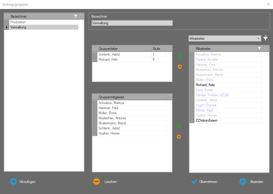 - einen oder mehrere Gruppenleiter der Mitarbeitergruppe zuordnen; diese Gruppenleiter haben Zugriff auf die Mitarbeiter in der Mitarbeitergruppe;