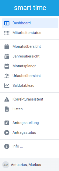 Nach der Anmeldung öffnet sich das sogenannte Dashboard. Ein Mitarbeiter, der über das Web zugreift, sieht standardmäßig nur seine eigenen Einträge. Wenn diese jedoch vom Administrator freigegeben wurden, hat er auch Zugriff auf Einträge von Kollegen, die denselben Vorgesetzten haben. Das Buchen über das Webterminal ist nur möglich, wenn der Vorgesetzte die entsprechenden Freigaben in der Benutzerverwaltung von smart time PLUS erteilt hat. Buchungs- und Abwesenheitsanträge werden von seinem Vorgesetzten genehmigt.