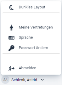 Dunkles Layout / Helles Layout: Umschalten der Bildschirmansicht zwischen Hell- und Dunkel Meine Vertretungen: Bei Bedarf können von einem Vorgesetzten für die Antragsbearbeitung Vertretungen festgelegt werden Passwort ändern: Berechtigter Benutzer kann individuell sein Passwort ändern |