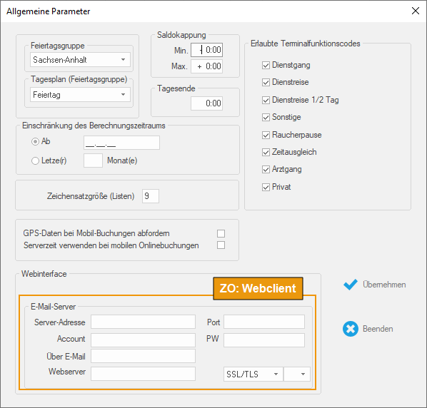 Webserver: Adresse des smart time plus Webservers / Zeiterfassungsservers zur Erzeugung eines direkten Links in der erzeugten E-Mail.